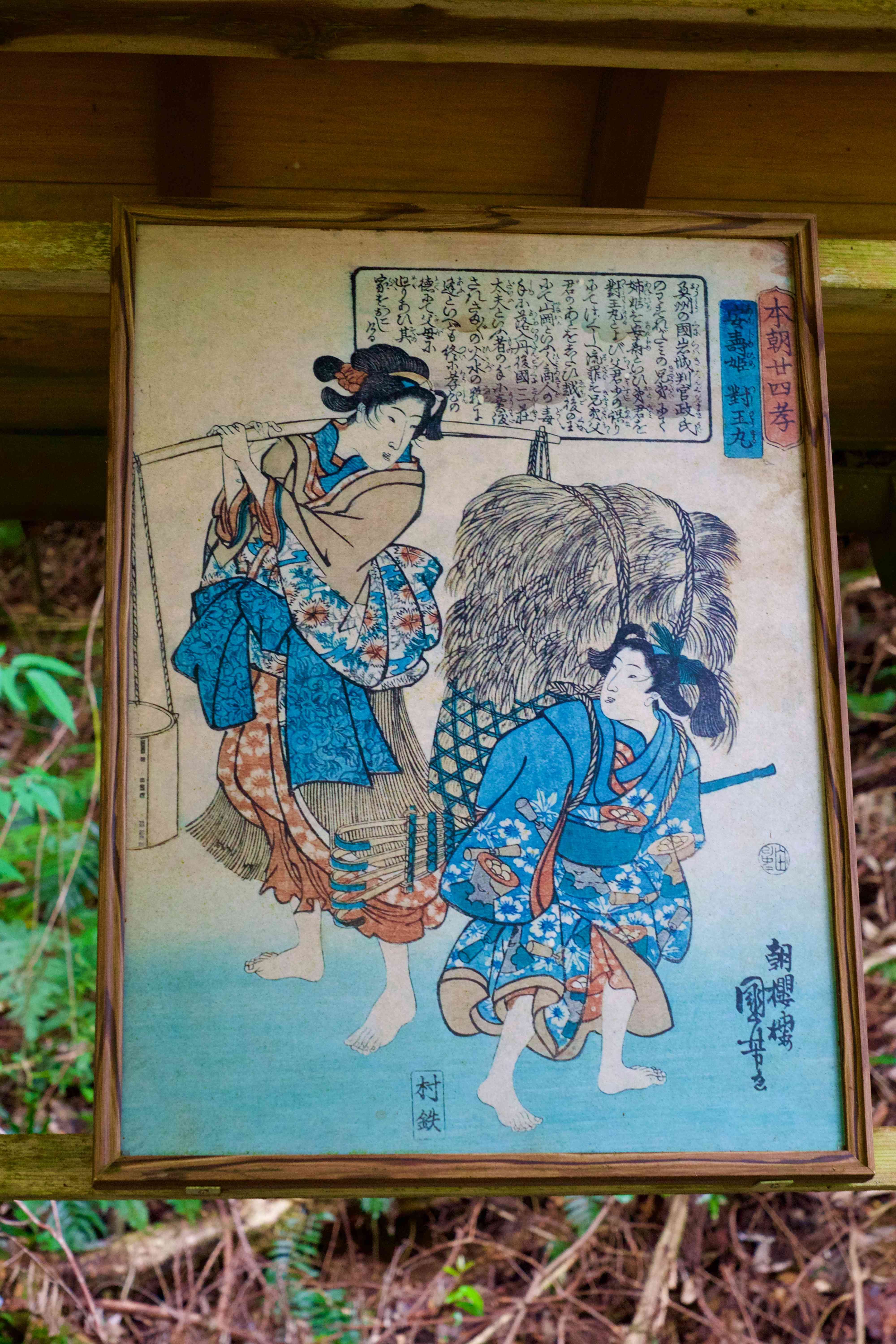 お堂の東屋に掲げてあった安寿姫と厨子王丸の版画絵(国芳)