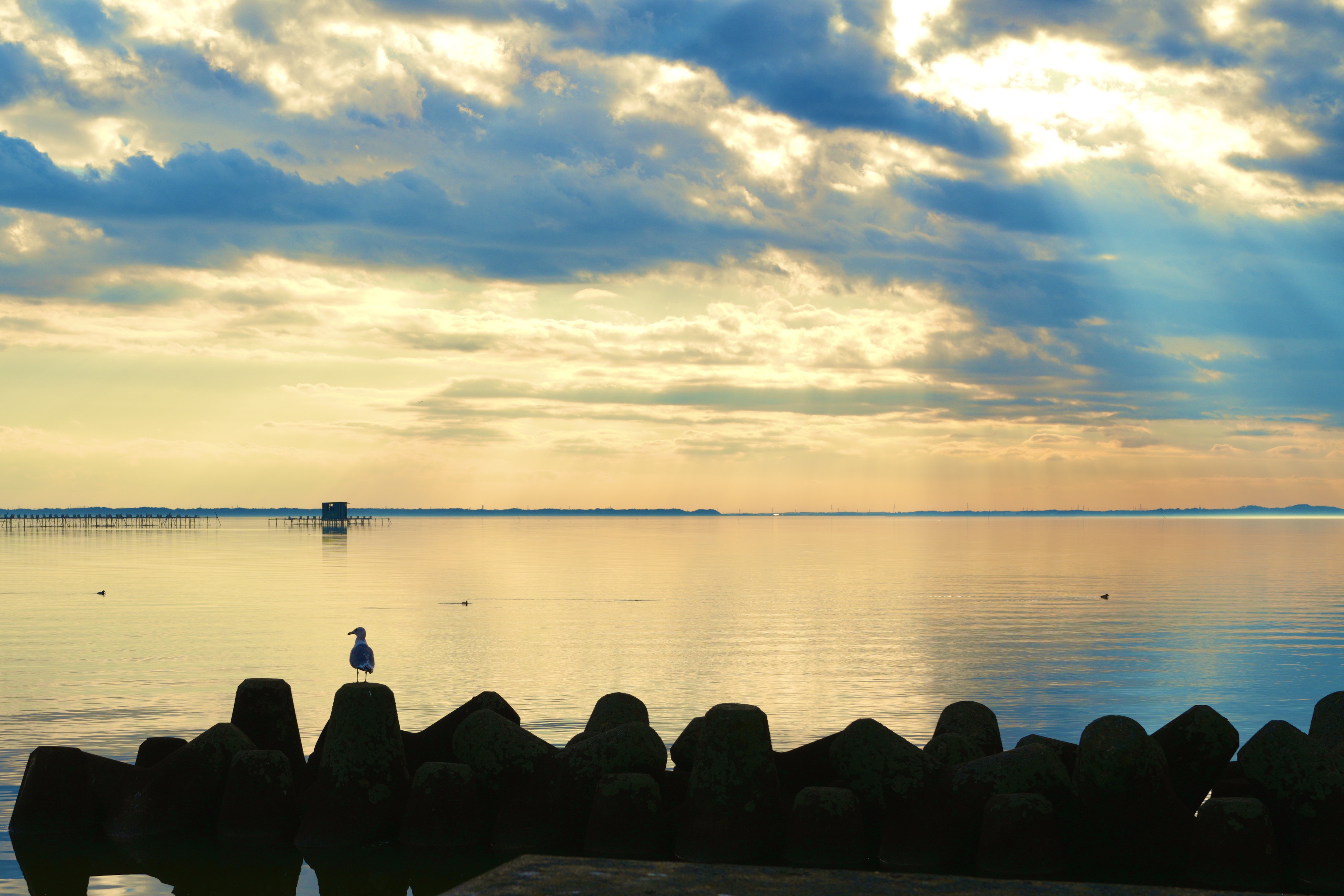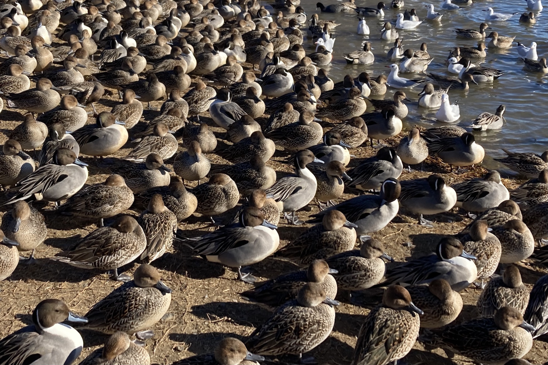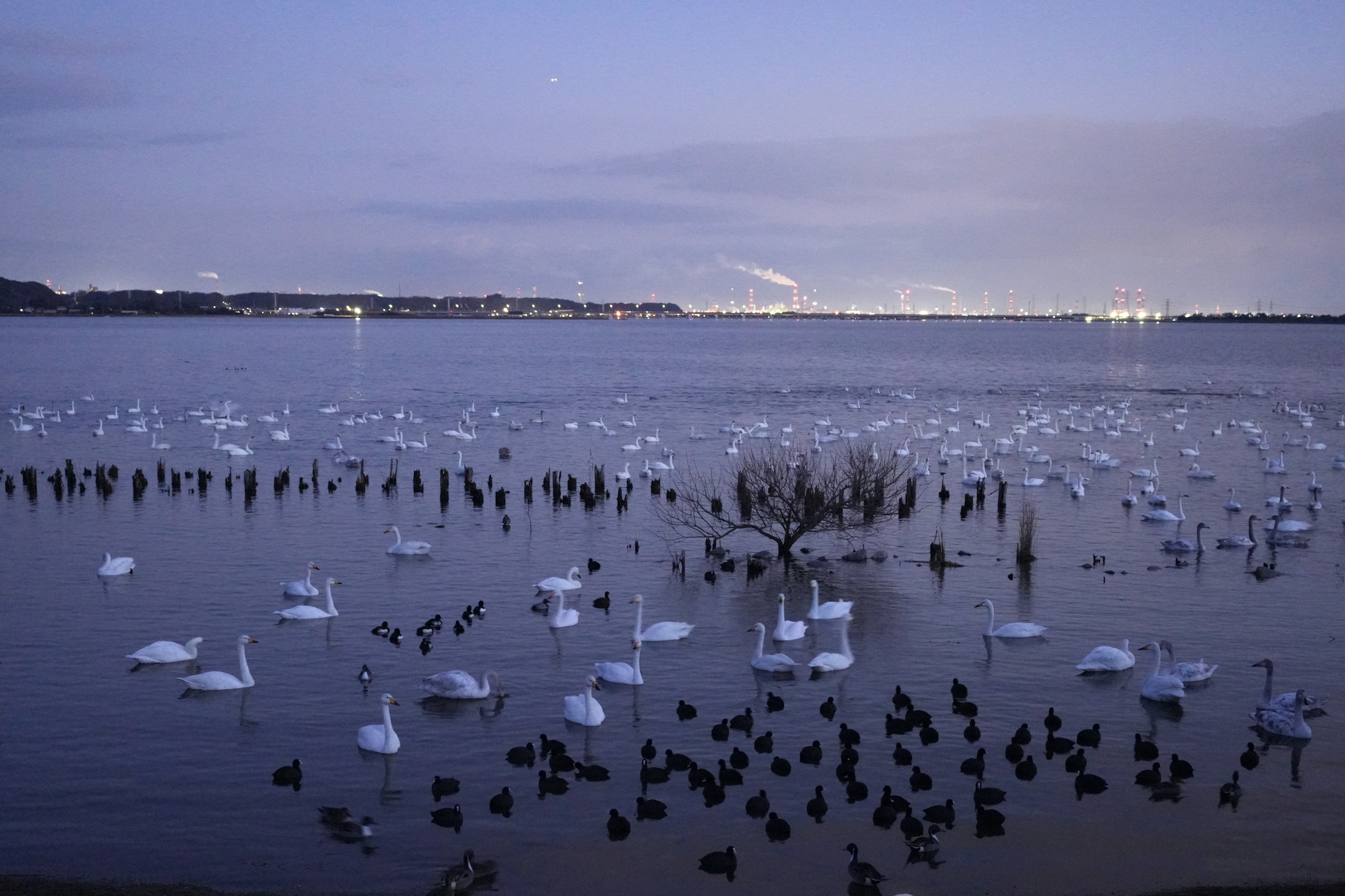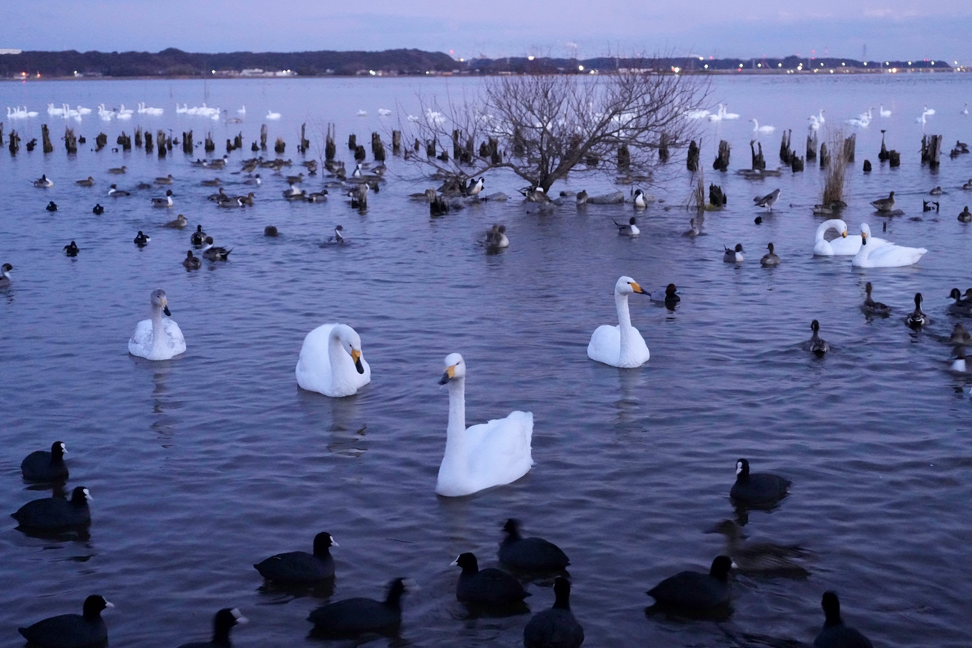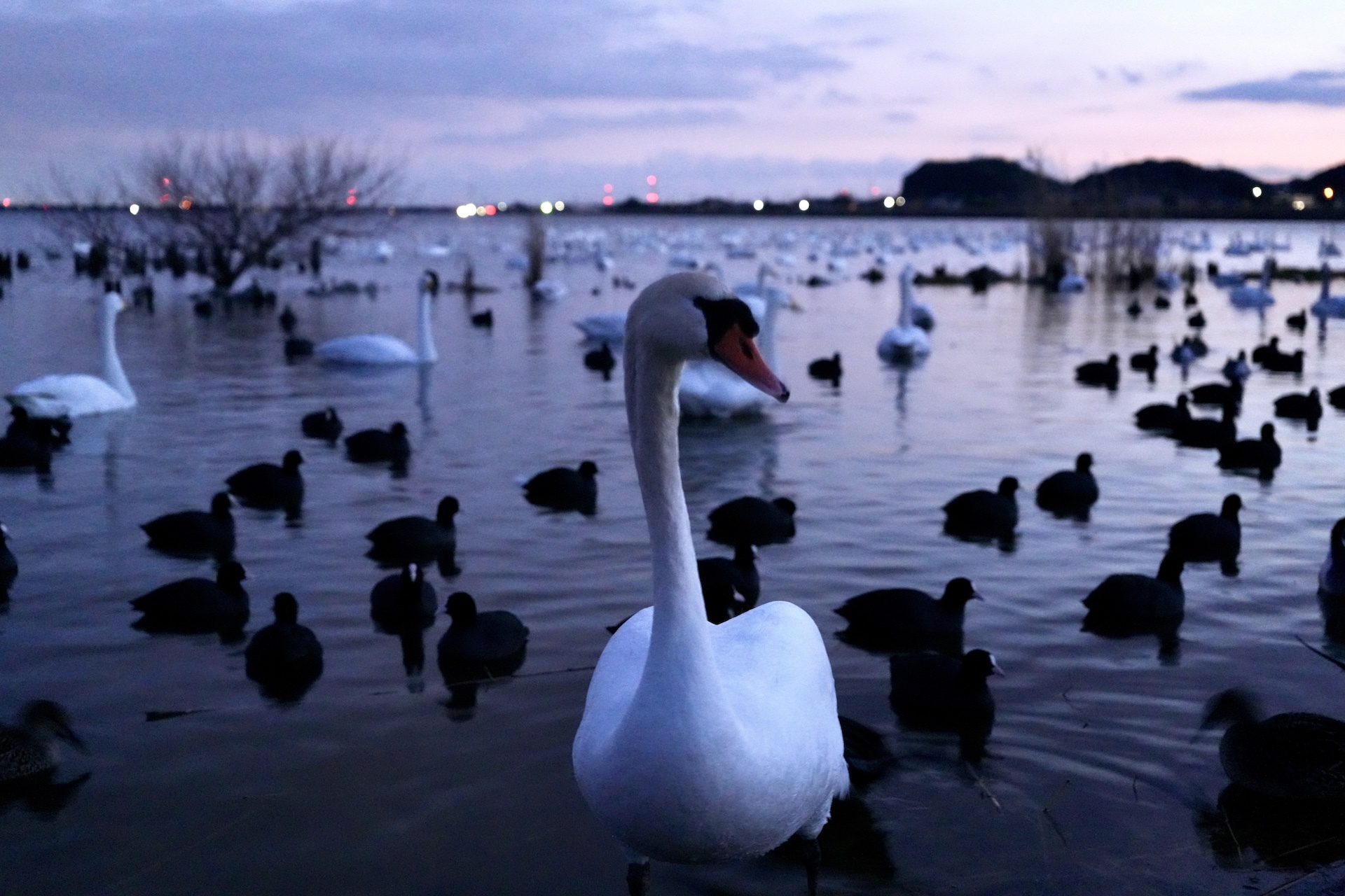 夕方、白鳥や水鳥たちがたくさん集まっていた!