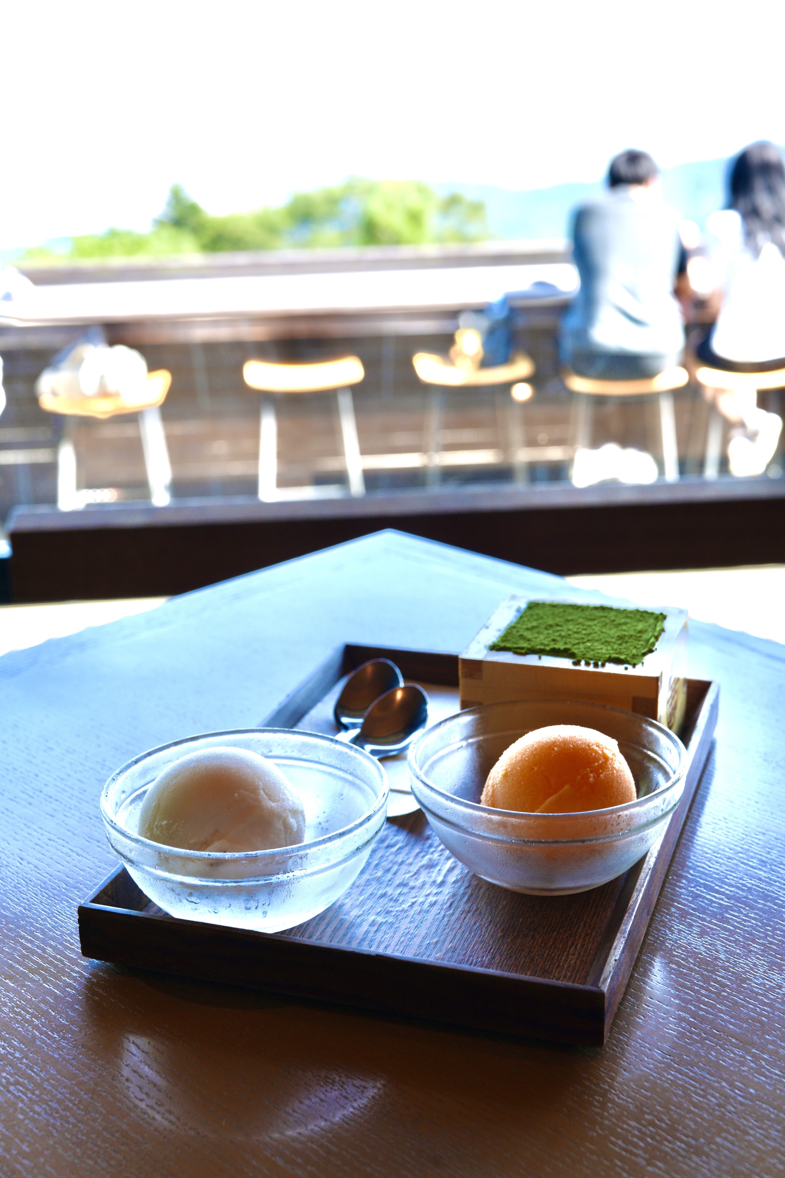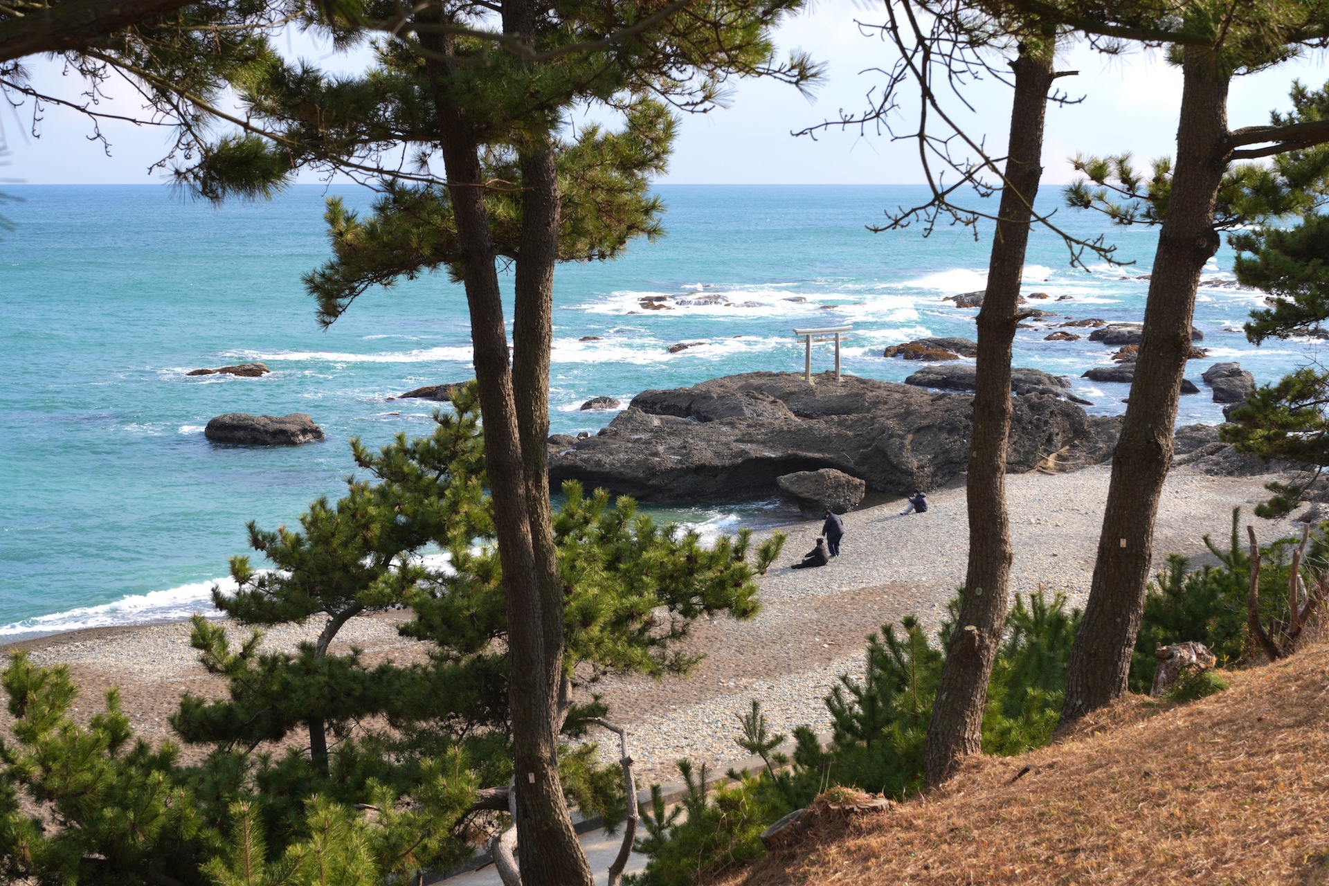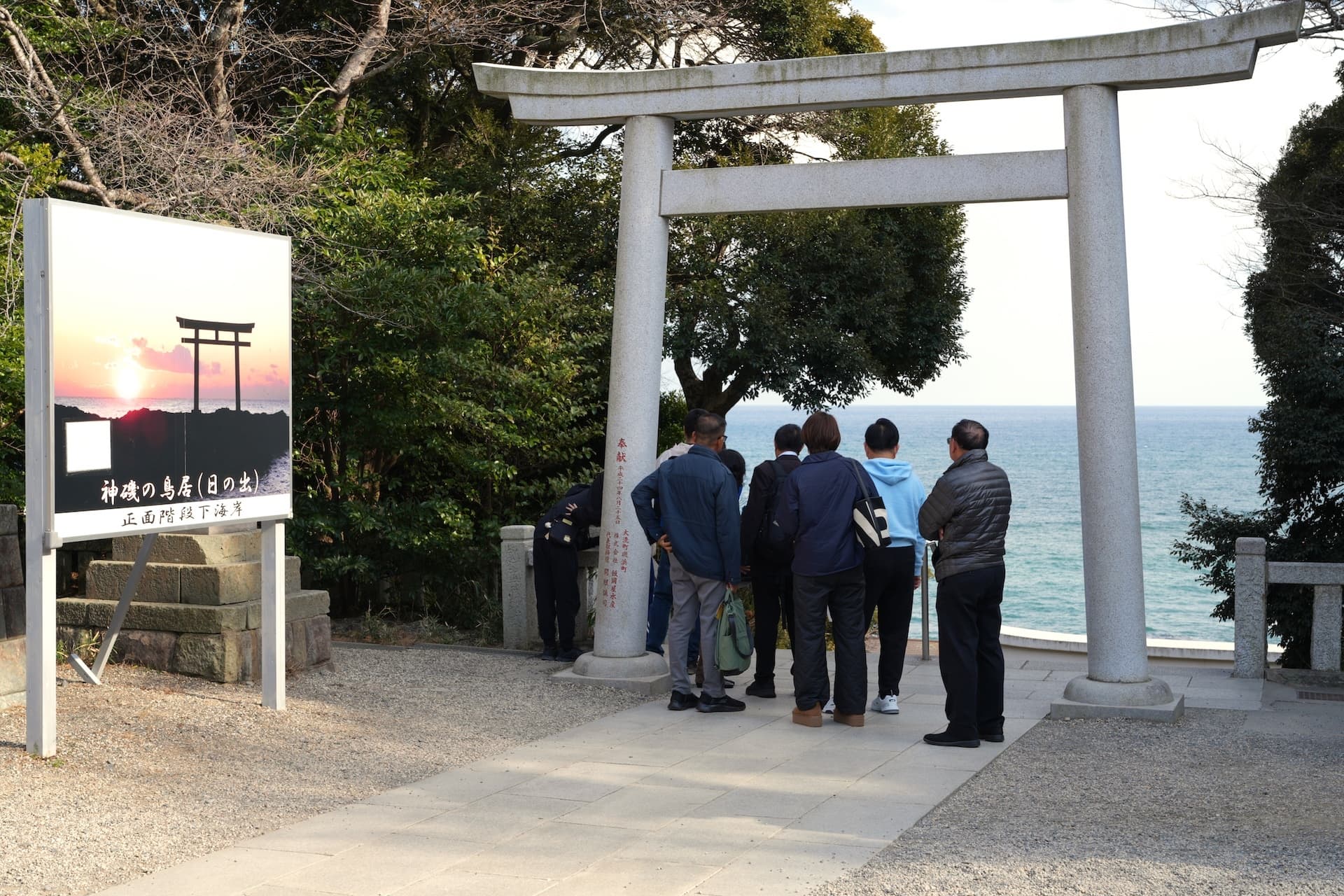 変わるがわる鳥居の下に続く階段とその下に広がる海を眺めている